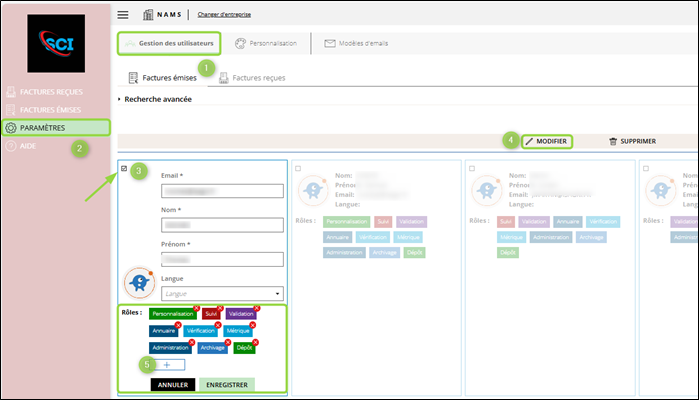 Pour accéder au module de personnalisation de l'interface, connectez vous au portail puis Paramètres/Gestion des utilisateurs/Modifier.