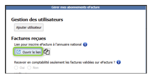 - Dans Accueil/Fiche entreprise/Facture électronique/Gérer mon compte