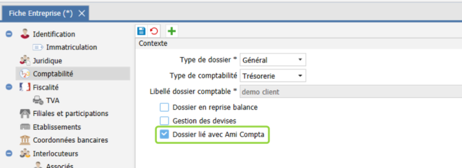 - Vous n'utilisez plus AMICOMPTA, il faut vérifier que le dossier n'est plus lié à AMICOMPTA en allant dans Accueil/fiche entreprise et en décochant la case suivante :
