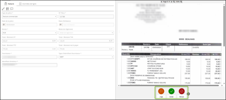 - La validation en mode détail qui vous permet de visualiser la facture concernée ainsi que les données extraites et de la valider ou de l'annuler directement depuis ce mode avant de revenir au mode liste.