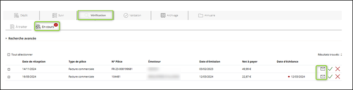 Cet onglet permet de vérifier dans un premier temps la facture. En cliquant sur la facture, vous avez accès aux différentes options de vérification.