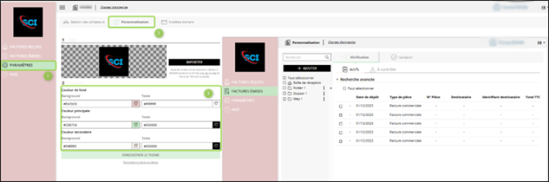 Sur le portail eFacture cliquez sur la rubrique Paramètres et sur le sous-onglet Personnalisation.