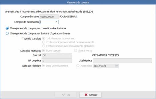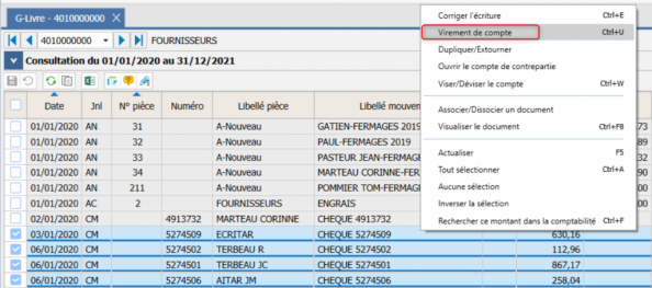 Comment effectuer un virement de compte à compte ? Dans le grand livre, sélectionnez le ou les mouvements concernés et faites clic droit Virement de compte. Renseigner le compte de destination et choisir le mode de virement :