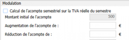 Pour moduler à la hausse ou à la baisse l'acompte de TVA, il faut double cliquer sur la ligne de l'acompte concerné puis renseigner dans la zone 'Augmentation de l'acompte de' ou 'Réduction de l'acompte de' le montant nécessaire pour atteindre l'acompte souhaité.