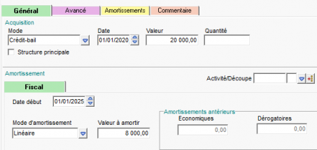 Exemple : Souscription le 01/01/2020 à un crédit-bail qui avait une valeur théorique de 20000 €, levée d'option le 01/01/2025 pour un montant de rachat de 8000€.