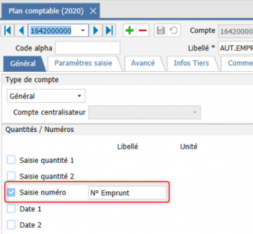 - Dans le ruban Paramètres menu Plan Comptable, la zone 'Saisie numéro' est cochée et le libellé (affiché dans la grille de saisie) renseigné,