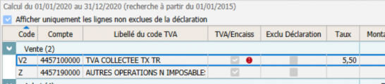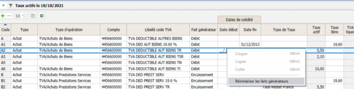 - Le bouton droit de la souris Réinitialiser les faits générateurs permet de mettre à jour le fait générateur de tous les codes TVA en fonction du type d'opération.
