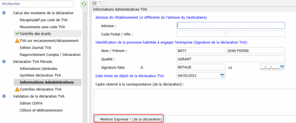 A quoi sert la case à cocher "Mention expresse" dans la branche Informations administratives ? Cette option est réservée uniquement à l'EDI. Elle permet de signaler le caractère urgent de la déclaration.